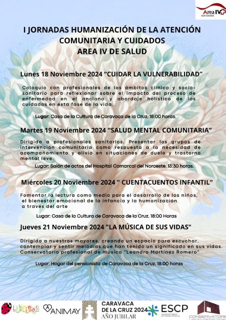 12/11/2024. Caravaca de la Cruz acoge del 18 al 21 de noviembre las primeras Jornadas de Humanización de la Atención Comunitaria y los Cuidados, organizadas por el Área IV de Salud del Hospital Comarcal del Noroeste, con actividades dirigidas tanto a los profesionales del ámbito sanitario como al público en general, abarcando las distintas edades de población.
